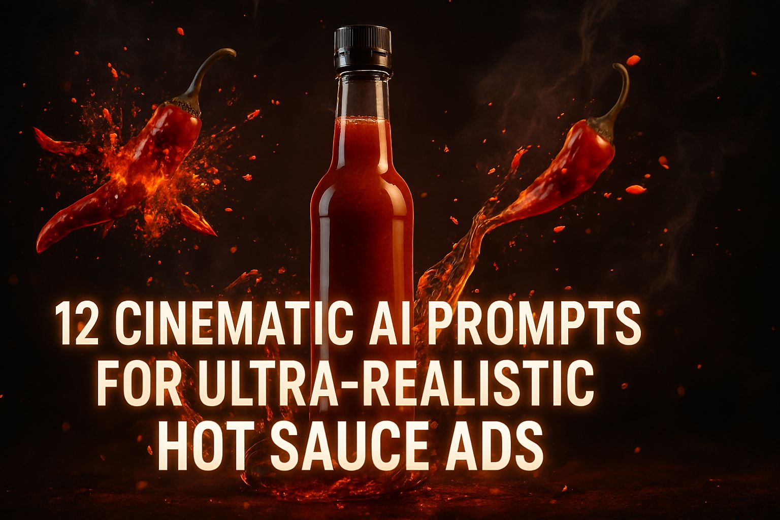 🌶️ Cinematic ultra-realistic food ad shot of a hot sauce bottle titled “Smolder Red Signature,” hovering in a smoky dark studio, roasted chilies shattering mid-air, spice particles swirling, frozen liquid splash curves, strong contrast lighting, warm cinematic glow, glass texture detail, premium branding look, 8k.